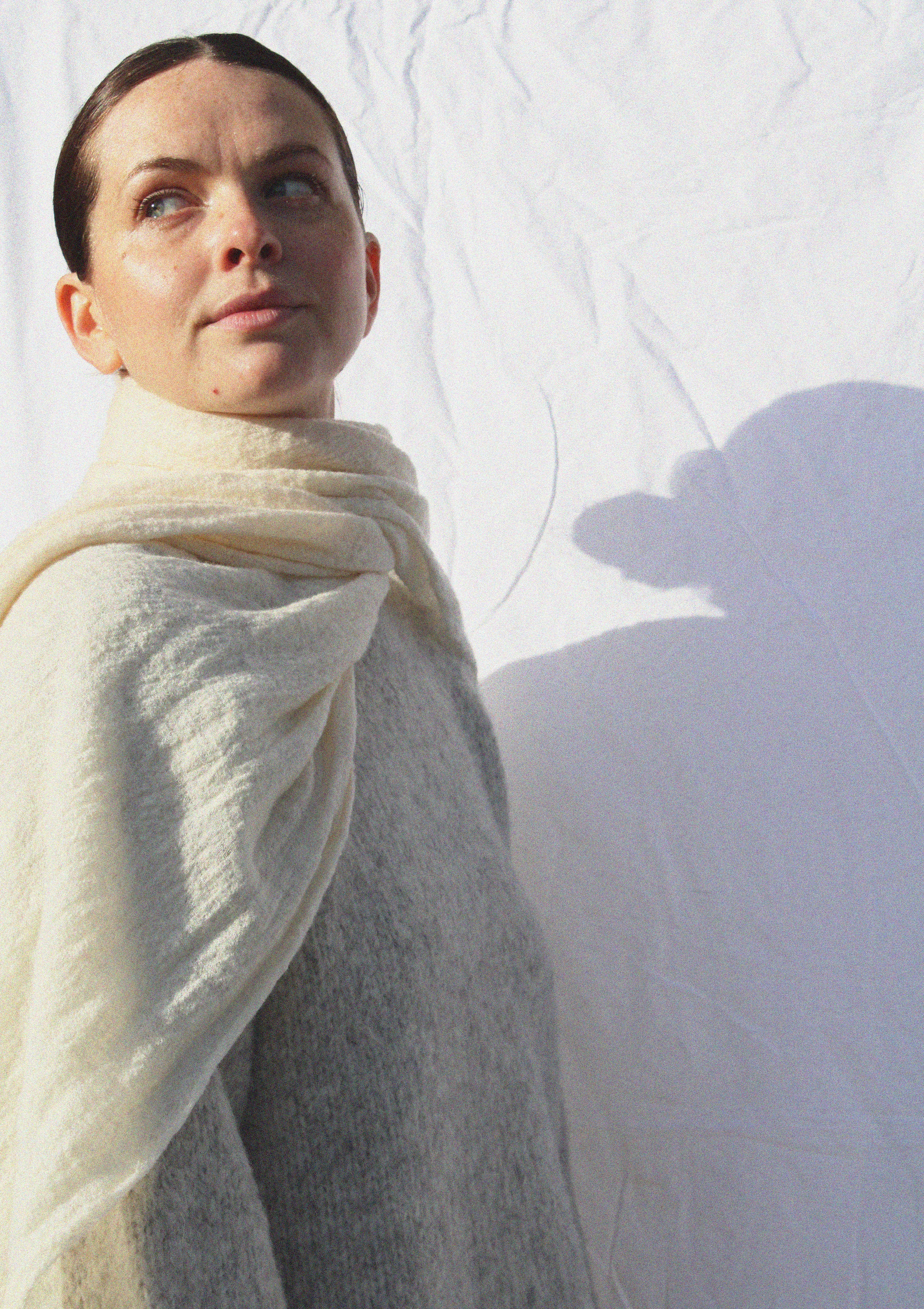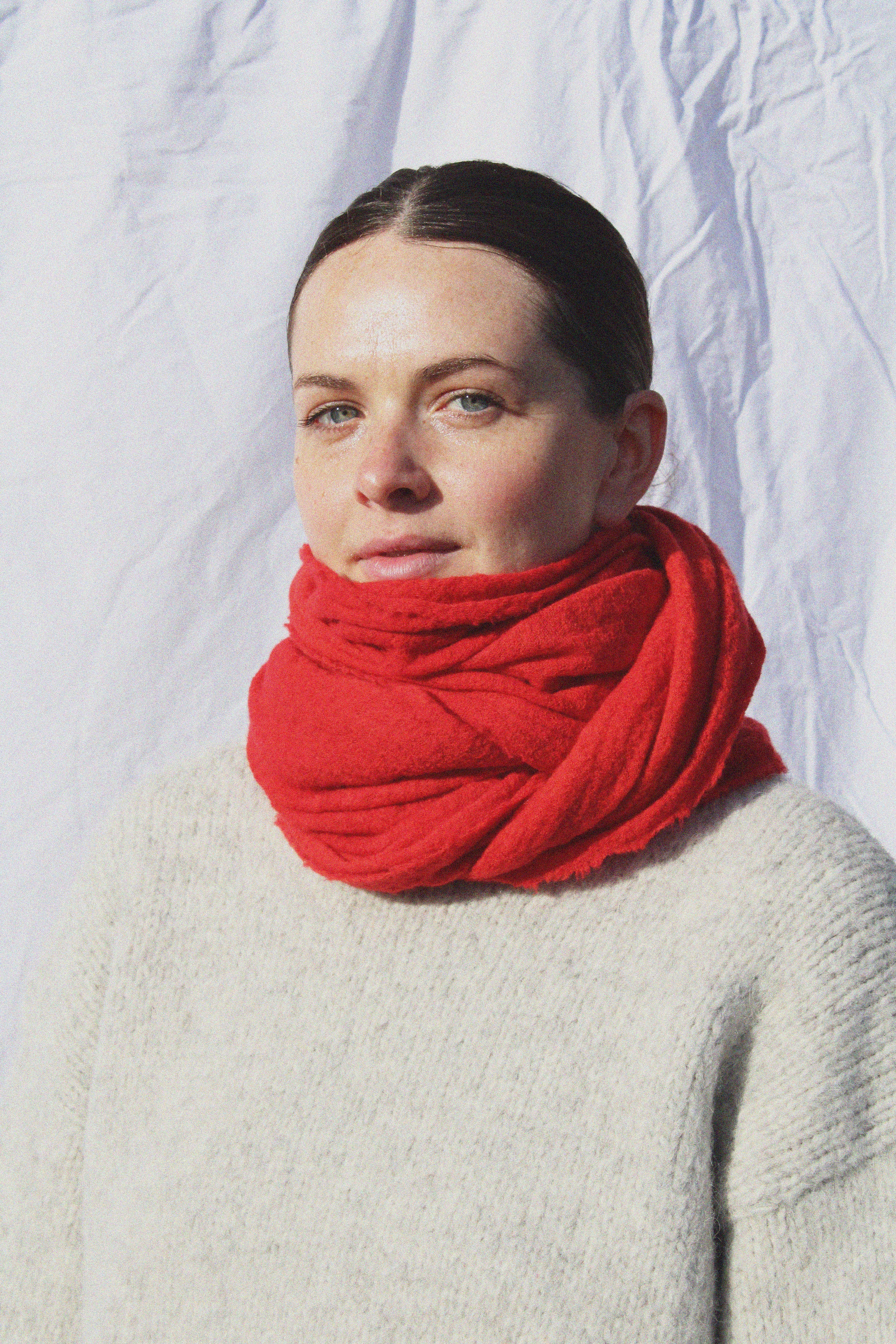 A soft, drapey knit scarf that ranges from slightly transparent to opaque. Has the textural look and feel of a cloud. Made from 100% hand dyed wool knit and available in three color ways: Tomato, Wool, and Jute.