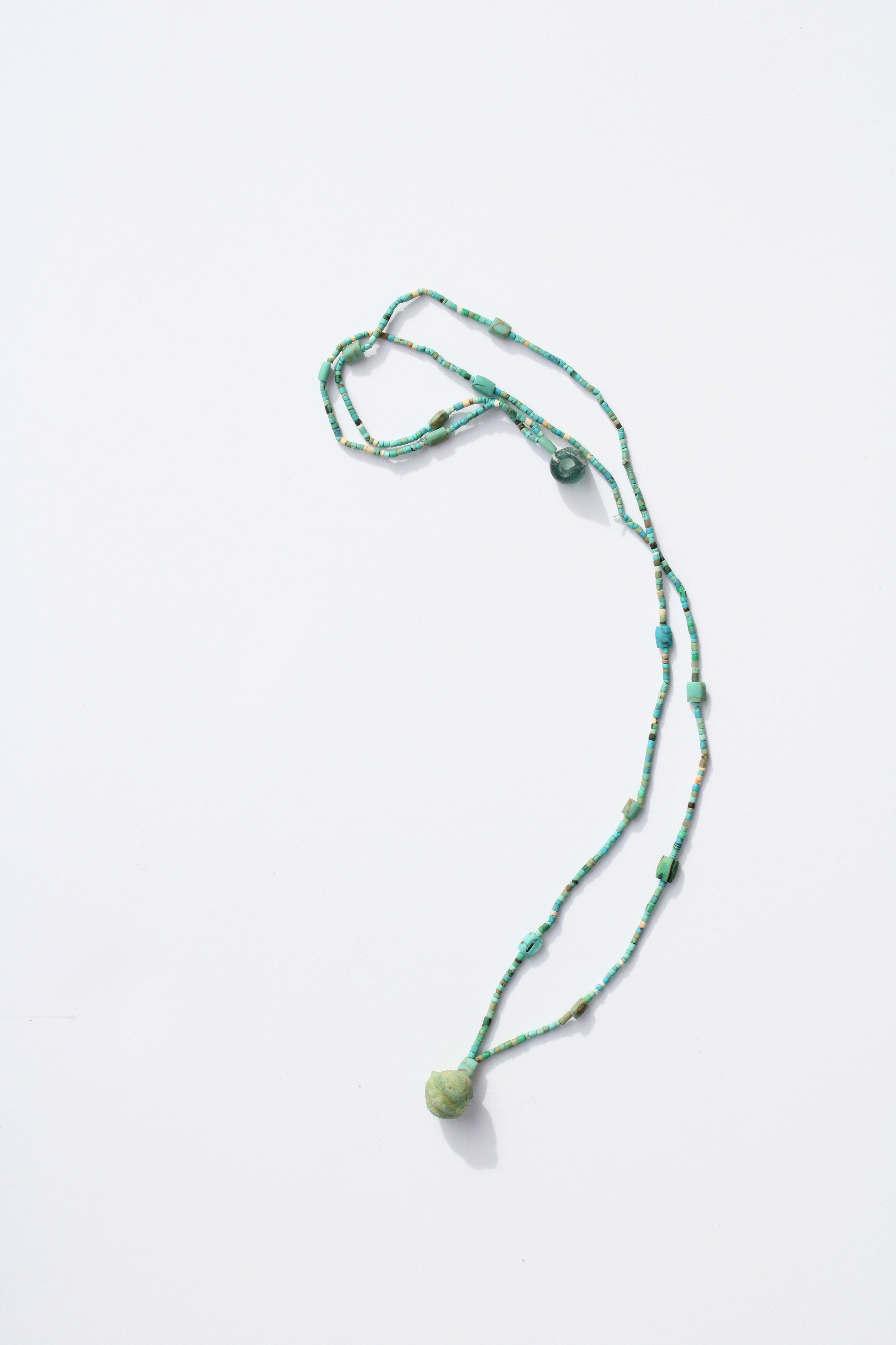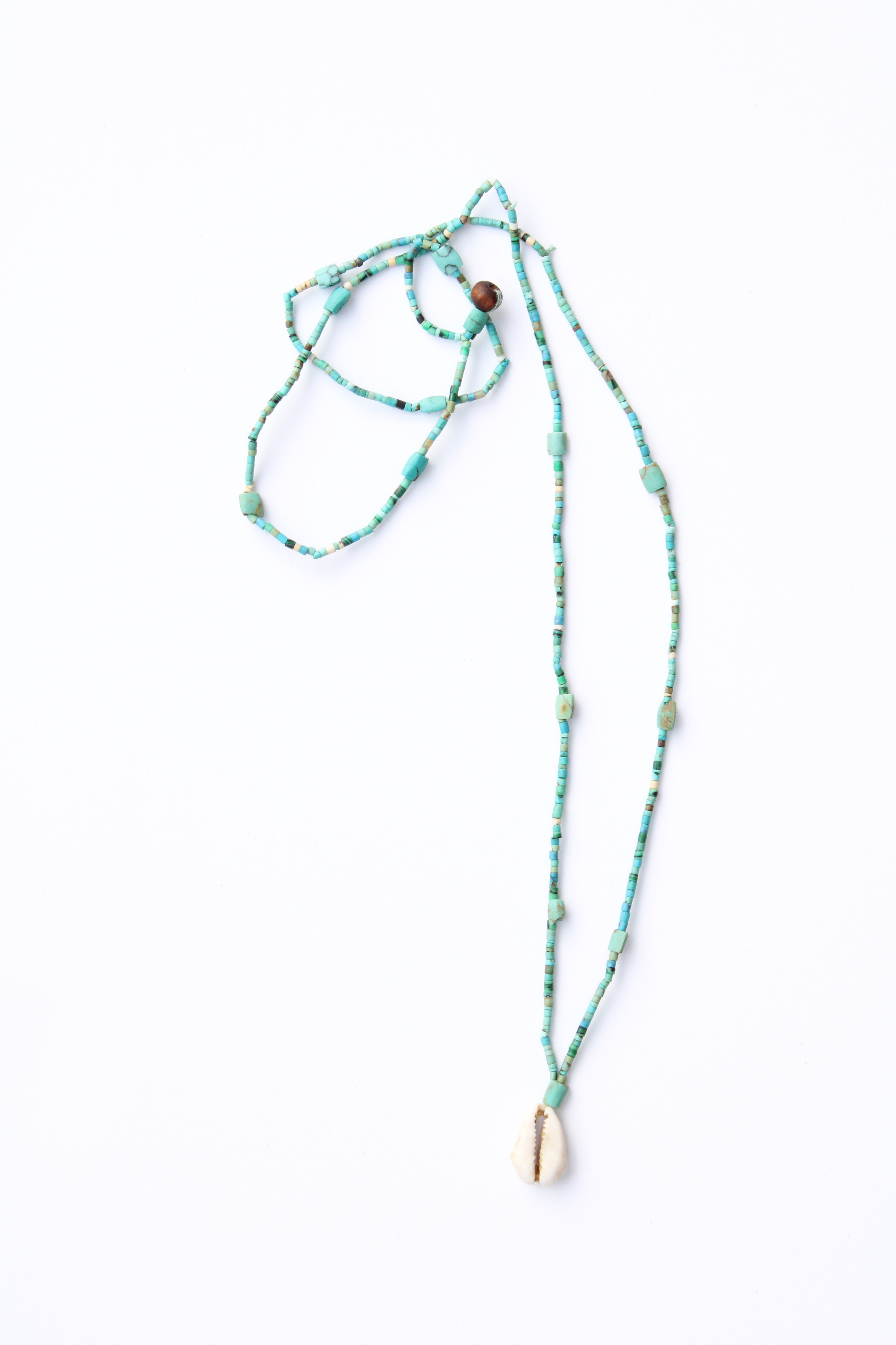 A special, long, strand of antique beads. Each one totally unique and crowned by a hand-picked focal bead, shell, or stone. Grounding by nature.