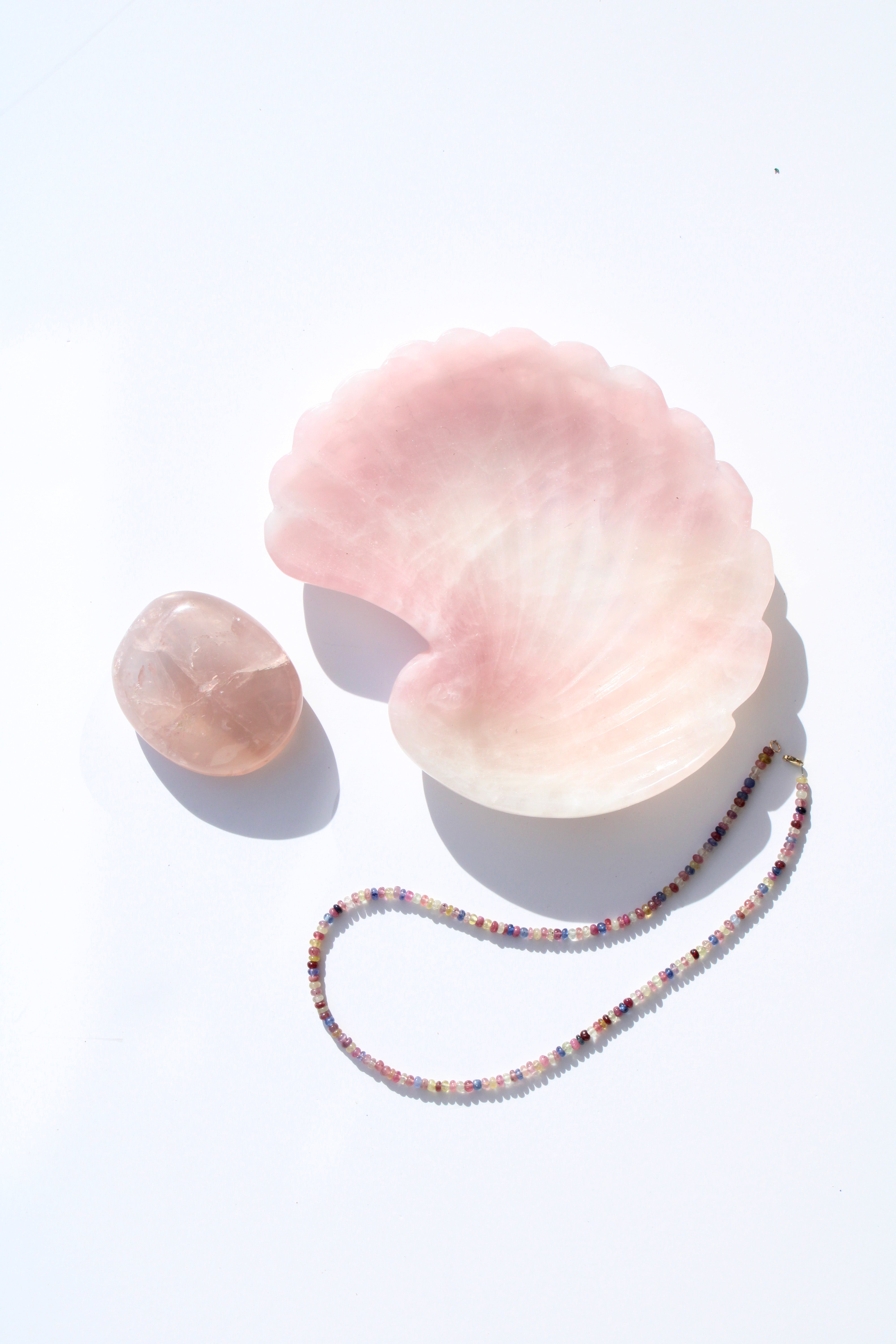 Leaning into the healing power of stones and the radiant qualities of rose quartz—including love and restoration—Takara has gathered a rare curation of glowing gems and specimens meant to complement and uplift. This selection includes an illuminating carved rose quartz shell dish, a smoothed rose quartz palm stone, and a strand of hand-carved sapphires. Each piece sparkles on its own, but the trio hums when they are together.