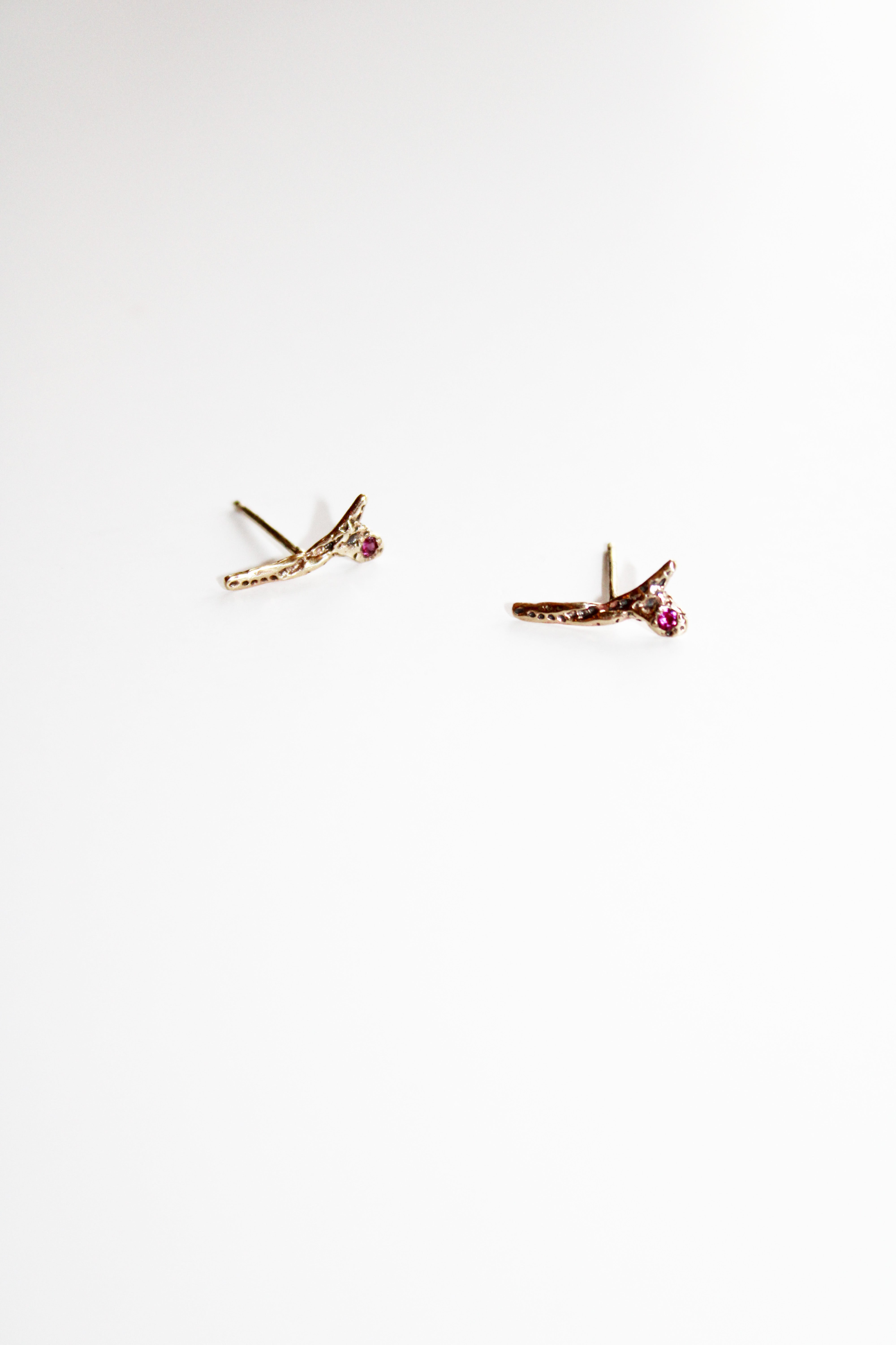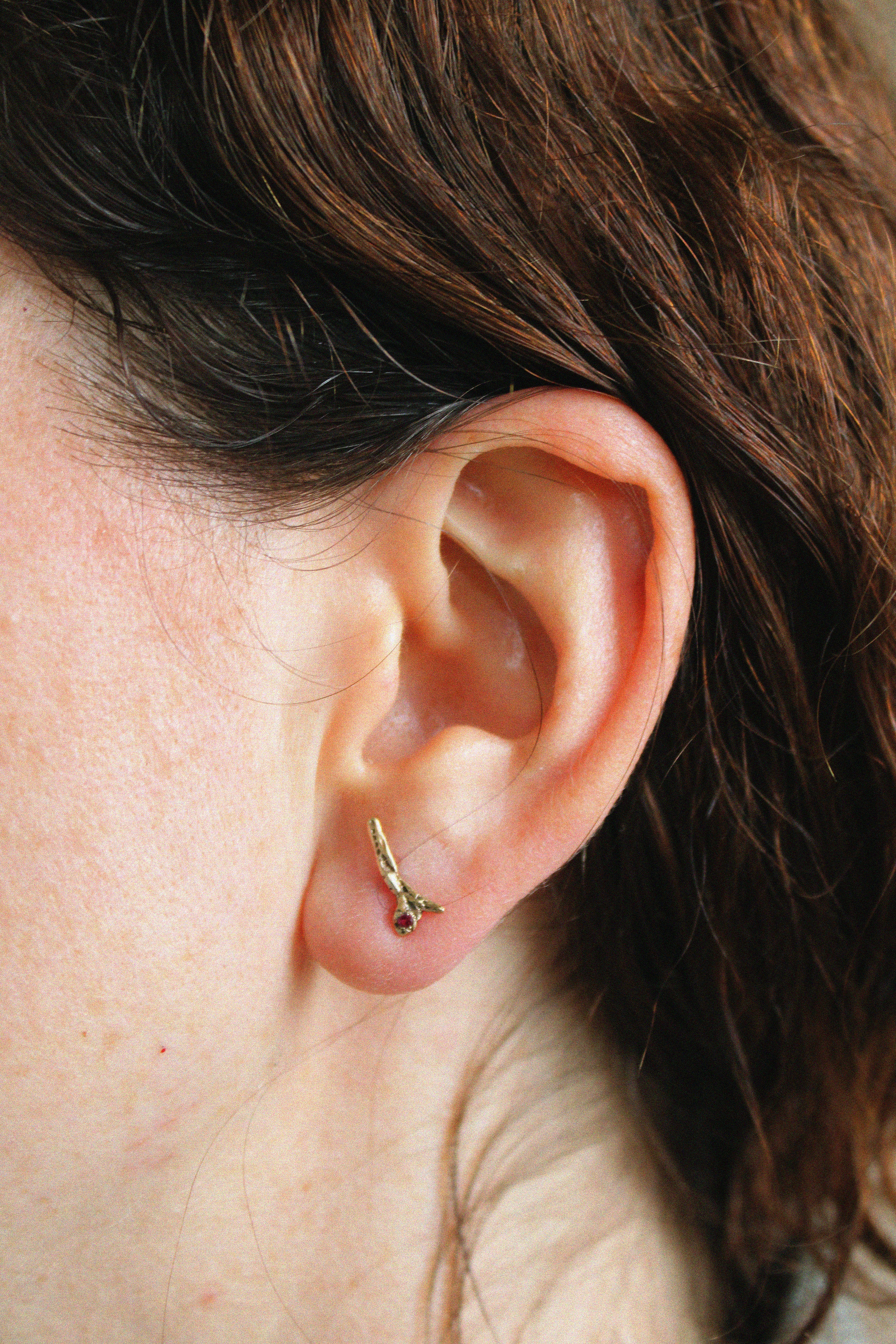 A gestural homage to a floral stem. Elegant, hand-shaped 14k gold stem with a shining ruby tucked inside. The perfect touch of radiance.