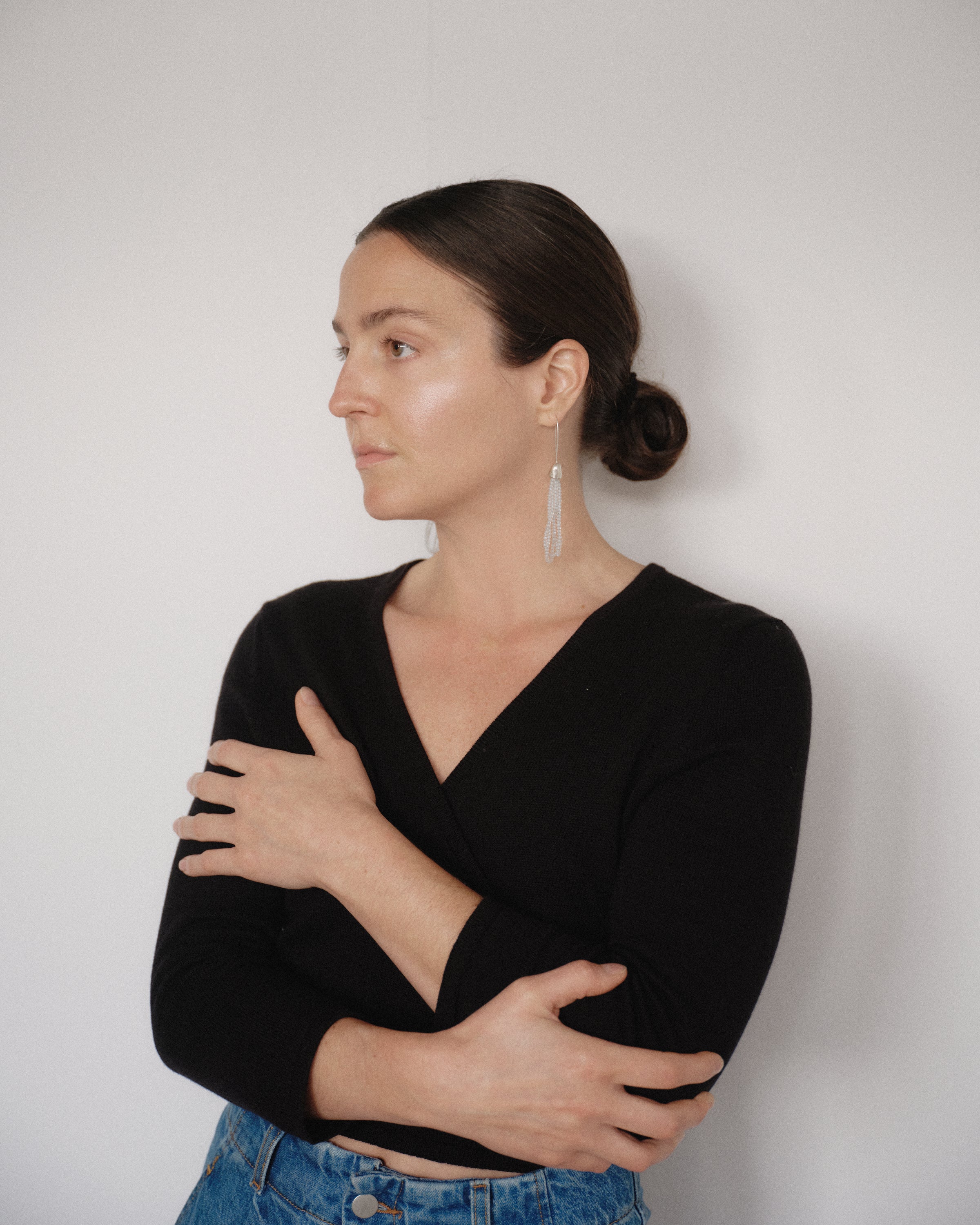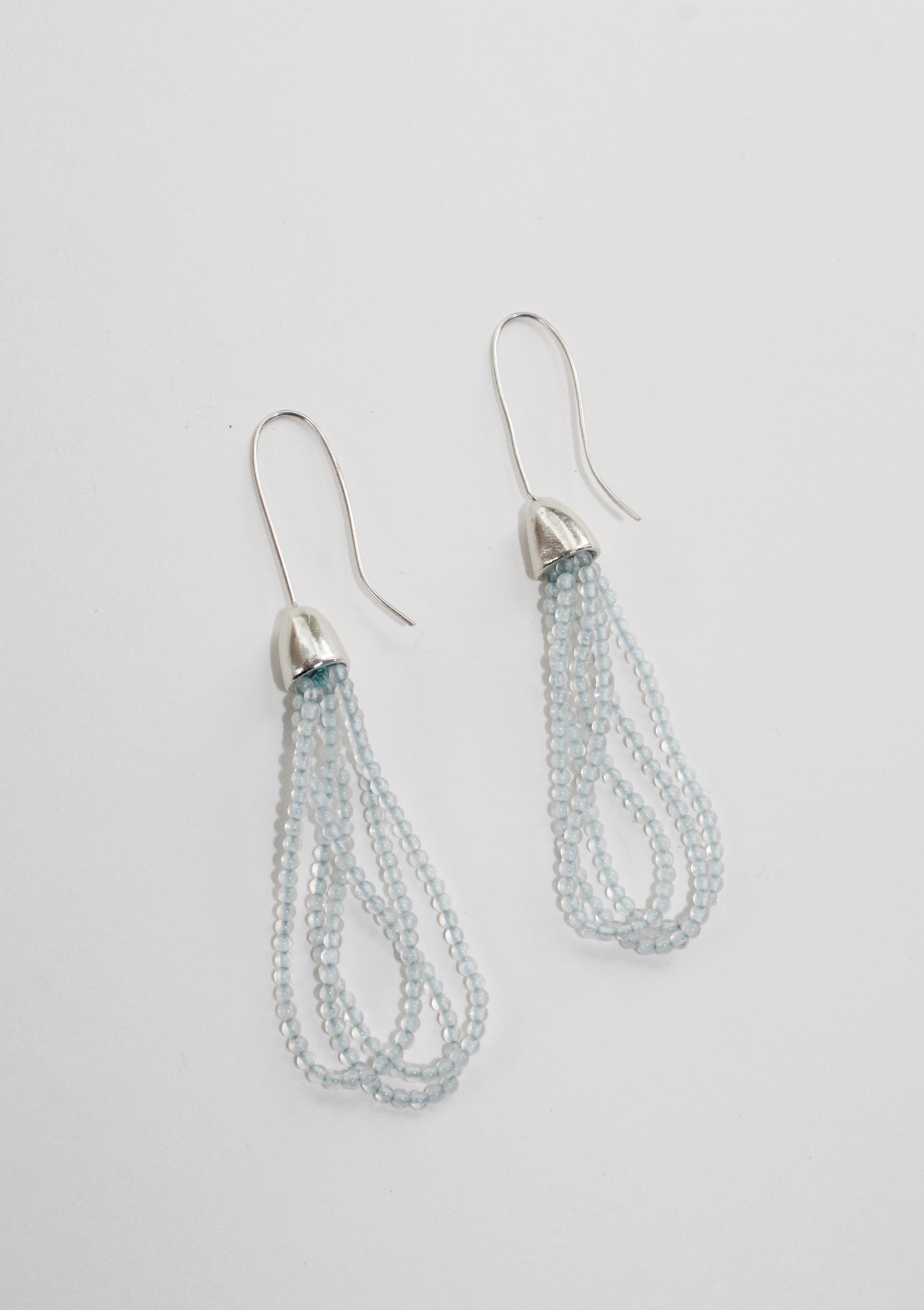Delicate Moonstone beads strung on silk thread and hung from sterling silver bells.