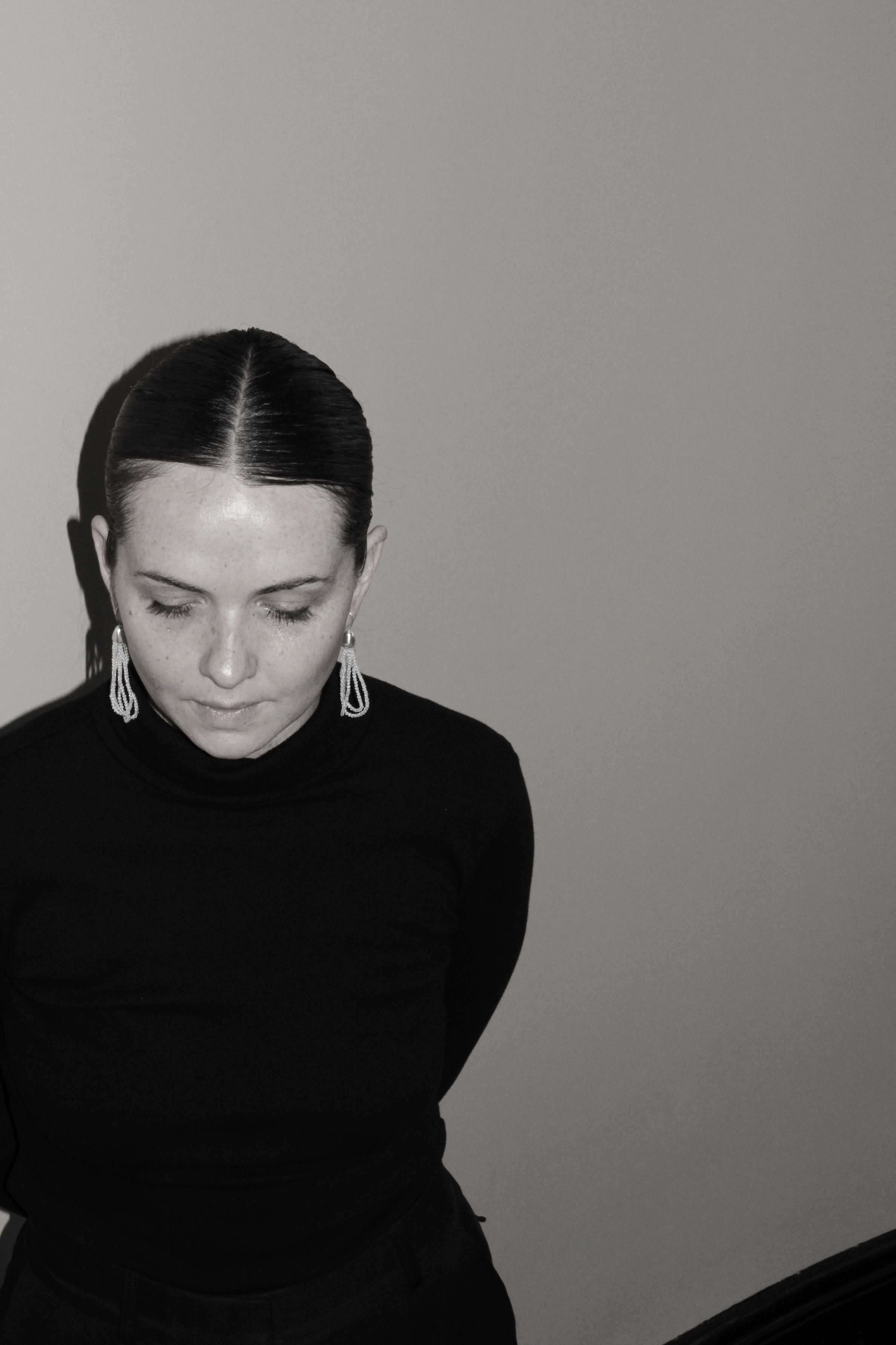 Delicate Moonstone beads strung on silk thread and hung from sterling silver bells.