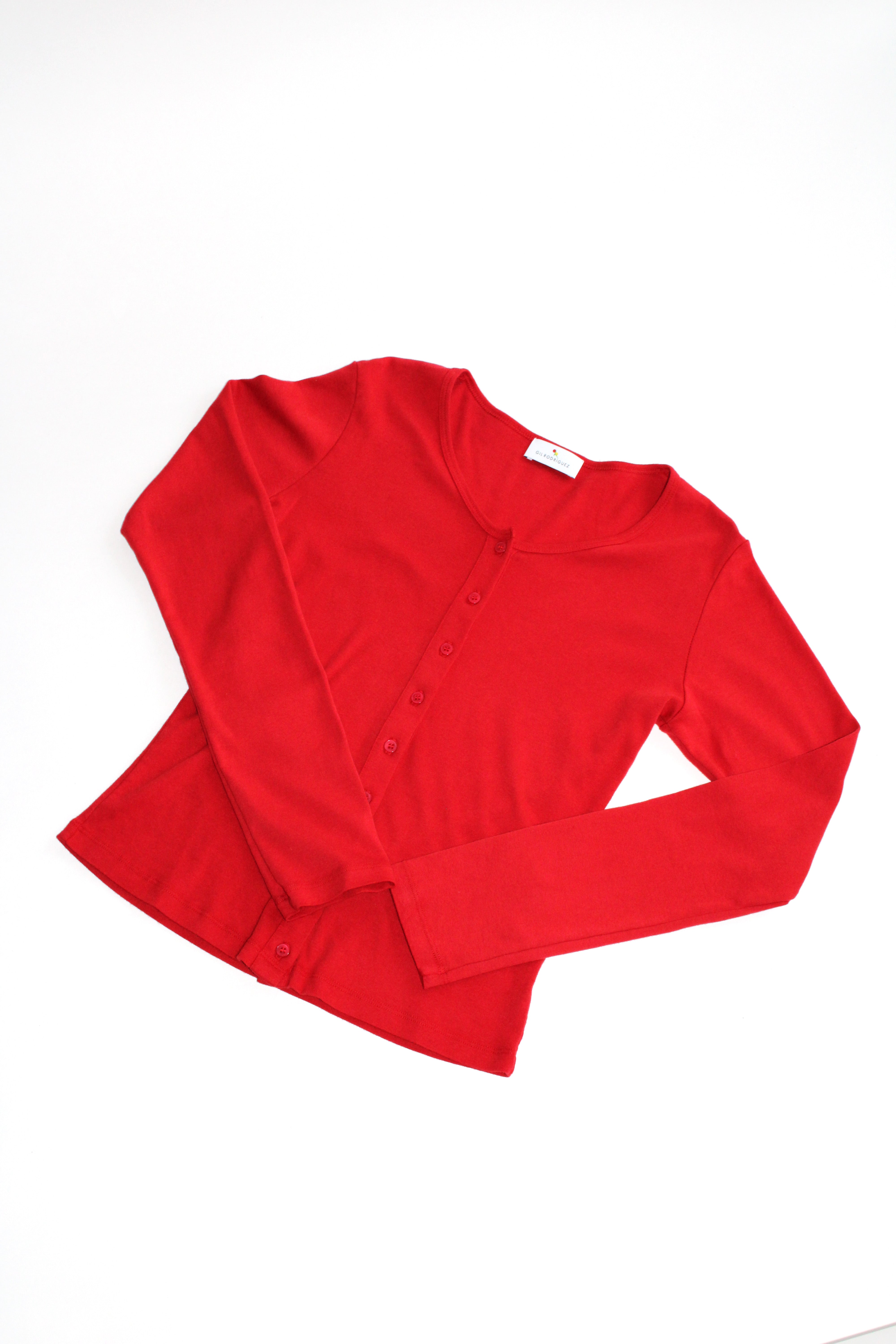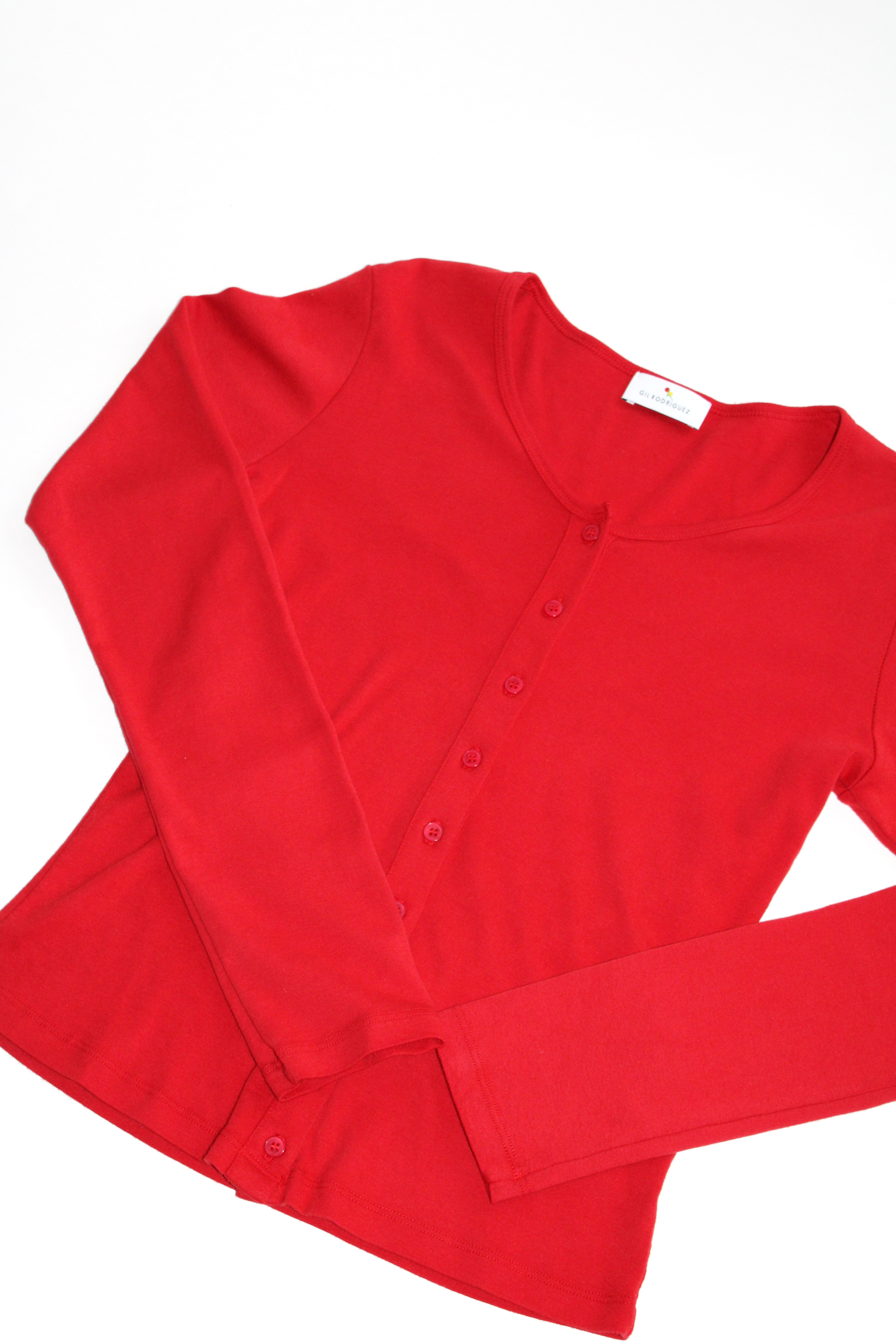 A long sleeve baby rib cardigan with button-closure and a scooped neckline. Made in Los Angeles from ultra-soft, locally-knit cotton baby rib.