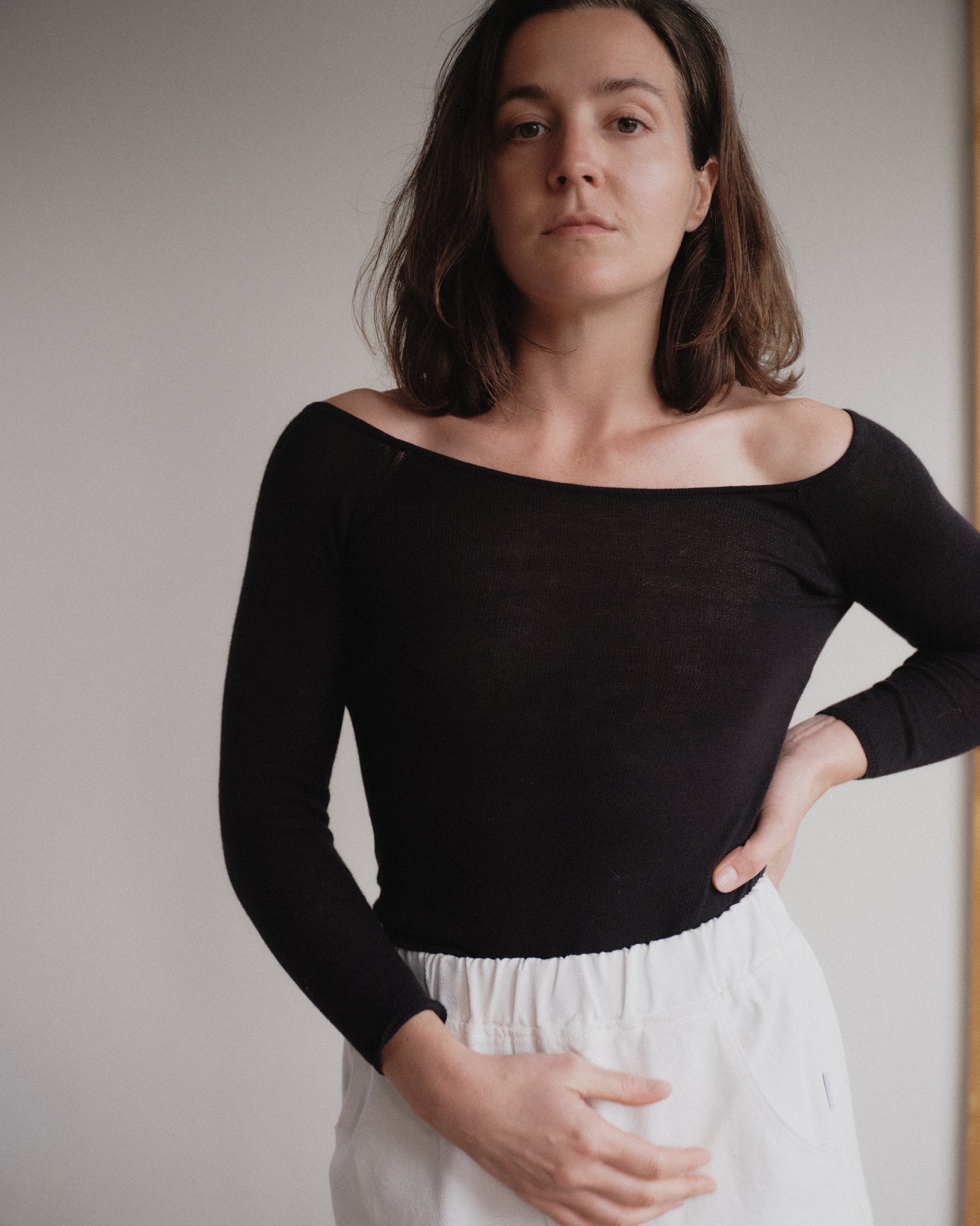 A soft base layer tee with a romantic ballet neckline and scooped back. Features three quarter length sleeves and a fitted yet easy cut. Made in a lightweight cotton blend.