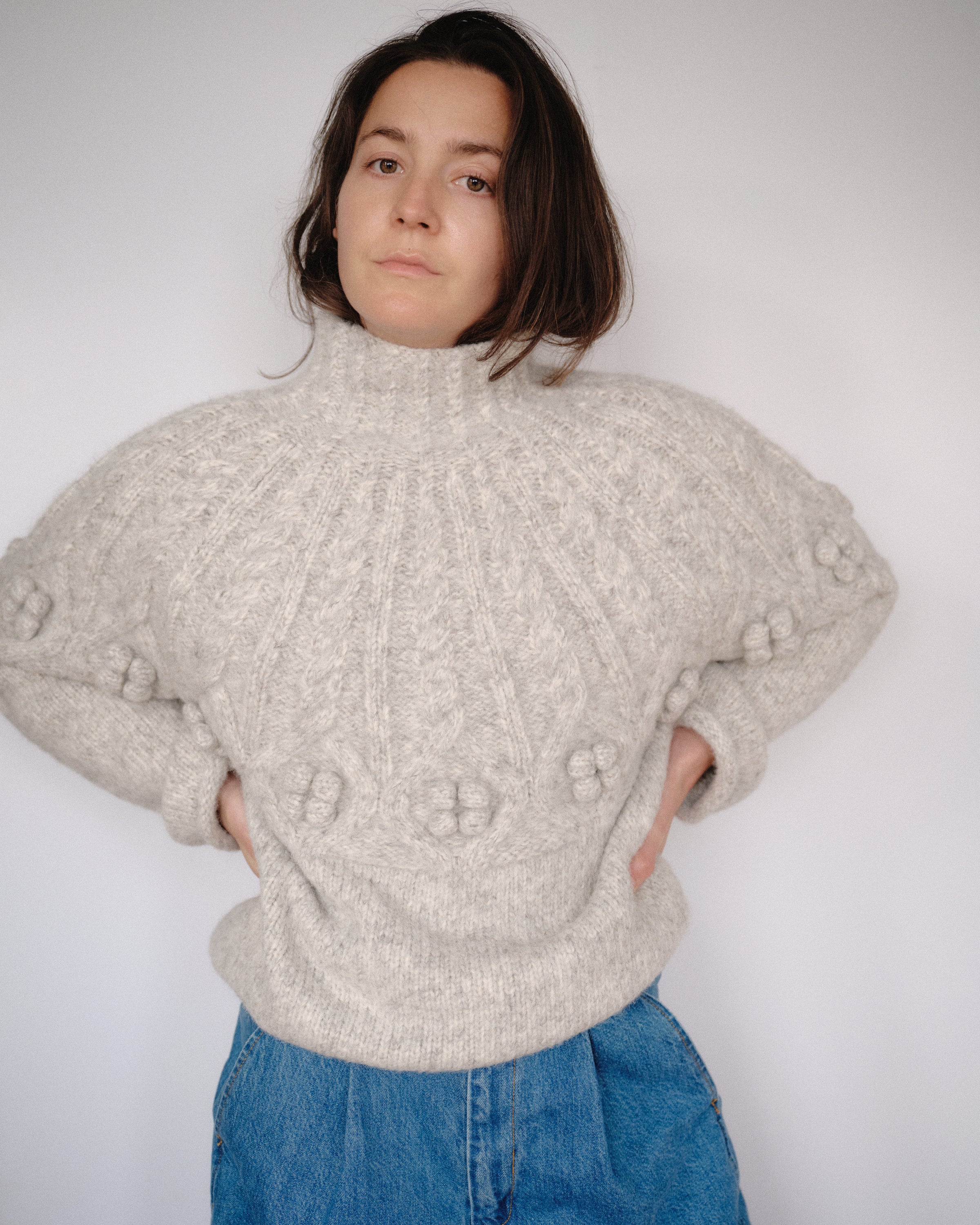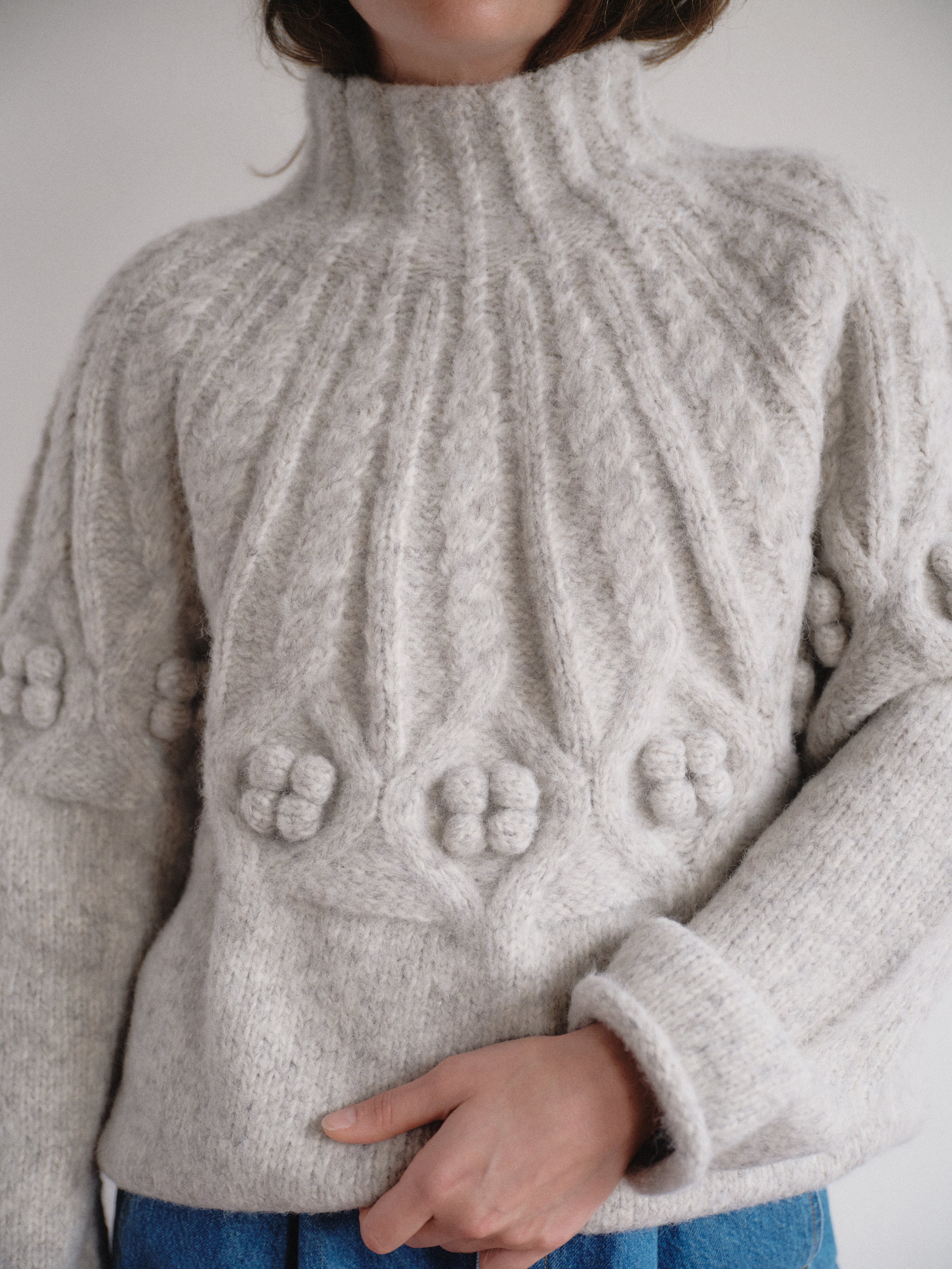 An heirloom piece, crafted by hand - The Carra Crop Sweater features a funnel neckline with a hand knit yoke detail featuring cables and baubles. Cropped, boxy shape with roll detail at hem and sleeves. Crafted in a super warm yarn of Cotton and Alpaca.